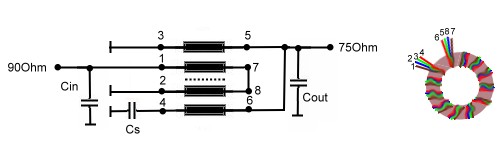 - We use varnish wire AWG 38, 6 times per cm twisted. ZL~70 Ohm. Z ~ 120 Ohm.