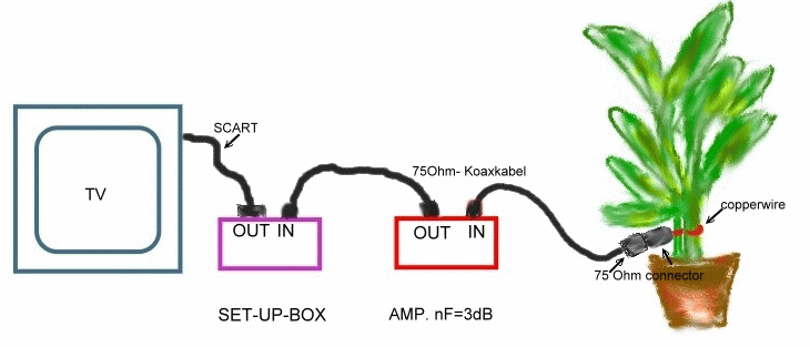 If one don’t want to use a technical device as an antenna, a room plant can be used instead as antenna to receive DVB. The plant to be used is the popular dieffenbachia. (don’t touch the sap of this plant).The plant is used as an lambda series resonator with L-coupling: